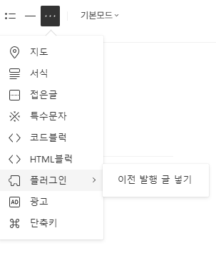 '플러그인 -> 이전 발행 글 넣기' 를 누르면 이전에 쓴 다른 글을 첨부할 수 있습니다.