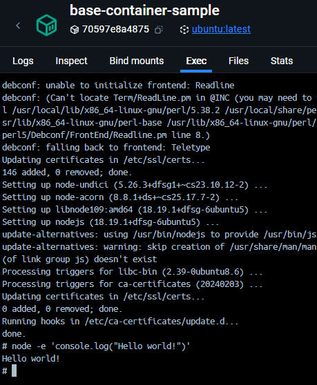 명령어를 입력한대로 컨테이너 내부에 Node.js가 설치됩니다.